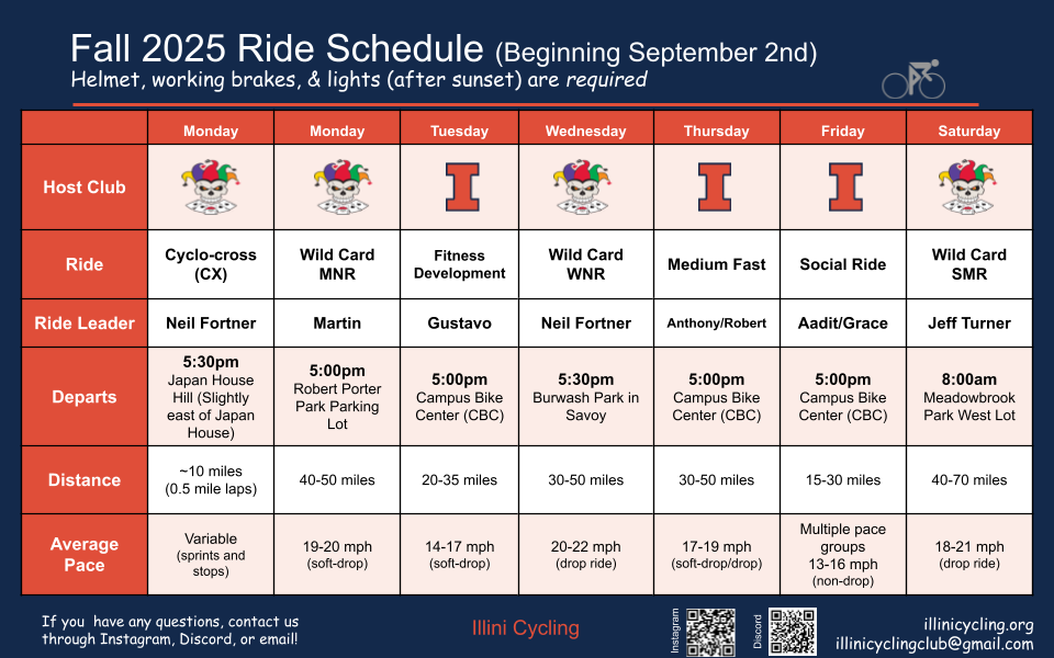 Rides usually start at Bike Lab by Neutral Cycle (624 S 5th St., Champaign, IL 61820) and generally follow a route from our route repository. Feel free to coordinate rides with other members in our Discord!